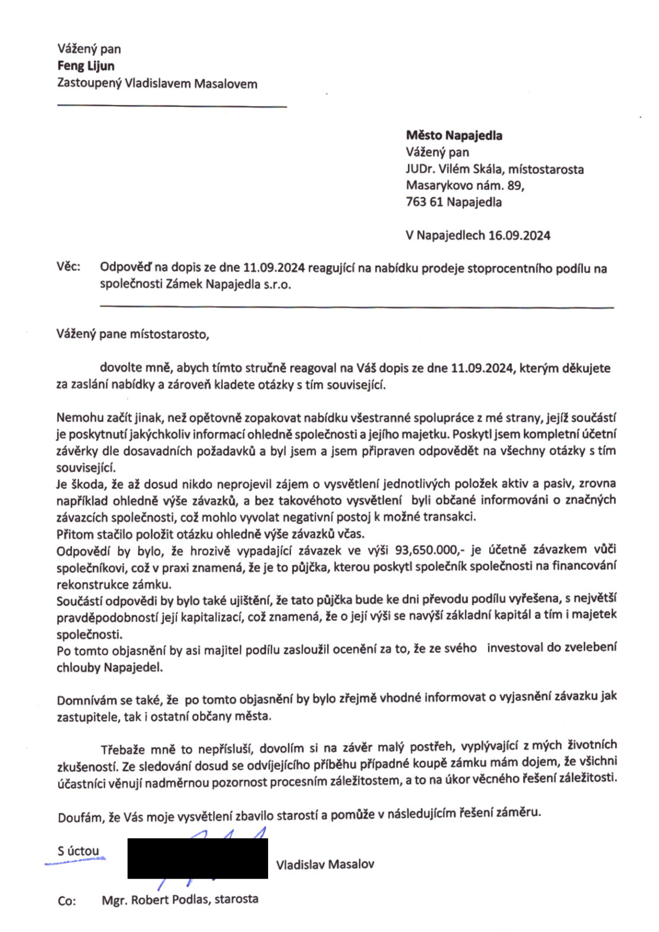 Dopis od zástupce společnosti Zámek Napajedla
