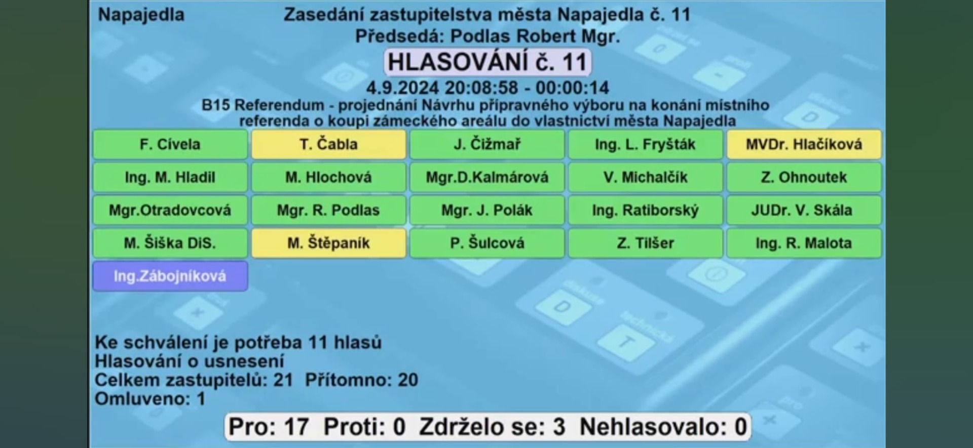 Děkujeme, že jste nás podpořili svými komentáři jak na místě, tak online. Moc to pro nás znamená a dává nám to další energii v naší snaze vytrvat.Jak vidíte na výsledku hlasování, zastupitelé vyhlášení referenda podle přípravného výboru nepodpořili (hlasovalo se o nevyhlášení referenda, tedy hlas "pro" znamenal hlas proti referendu), s výjimkou Michala Štěpaníka, Tomáše Čably a MVDr. Karly Hlačíkové, kteří se zdrželi. Tímto paní doktorce děkujeme za její včerejší odvahu zastat se občanů a jejich zájmů.